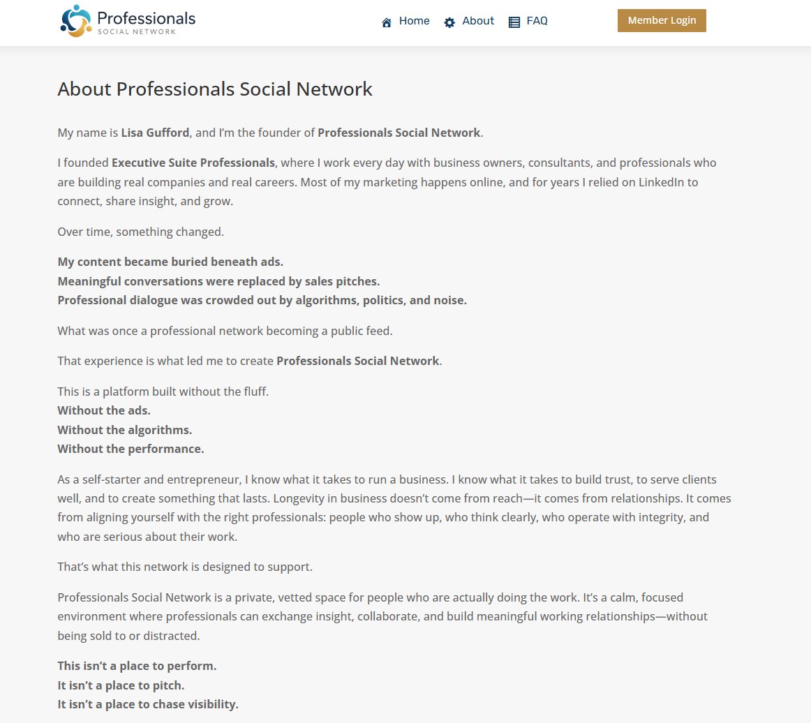 PSN was founded by Lisa Gufford — a 14-year veteran of Executive Suite Professionals who grew frustrated watching LinkedIn become a place of ads, algorithms, and noise. She built the network she wished existed. Read her full story on the About page.
