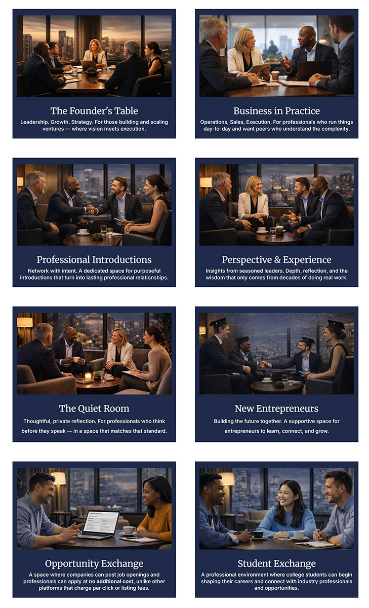 Enter one of eight curated spaces — from The Founder's Table to Professional Introductions — each designed for a distinct type of high-value exchange.