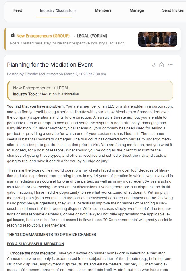 This isn't a place for hot takes and viral posts. Members share real professional insight — like Timothy McDermott's detailed breakdown of mediation strategy for New Entrepreneurs, or Lisa Gufford's analysis of AI's progression from 1950 to today. The depth here is unlike anything on public social media.