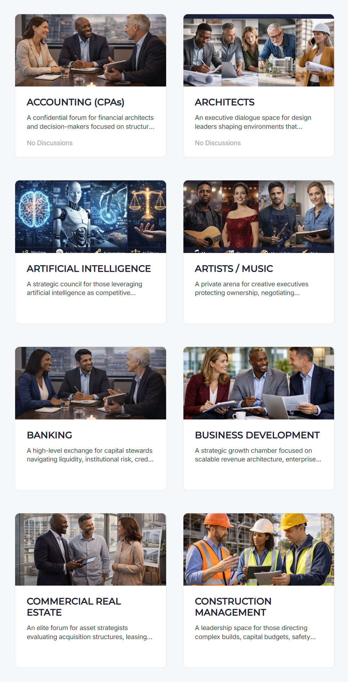 When you join, you choose which rooms and industry segments are relevant to you. Each industry has its own dedicated discussion space — so you're always in a conversation that matters to your work, not a generic feed.