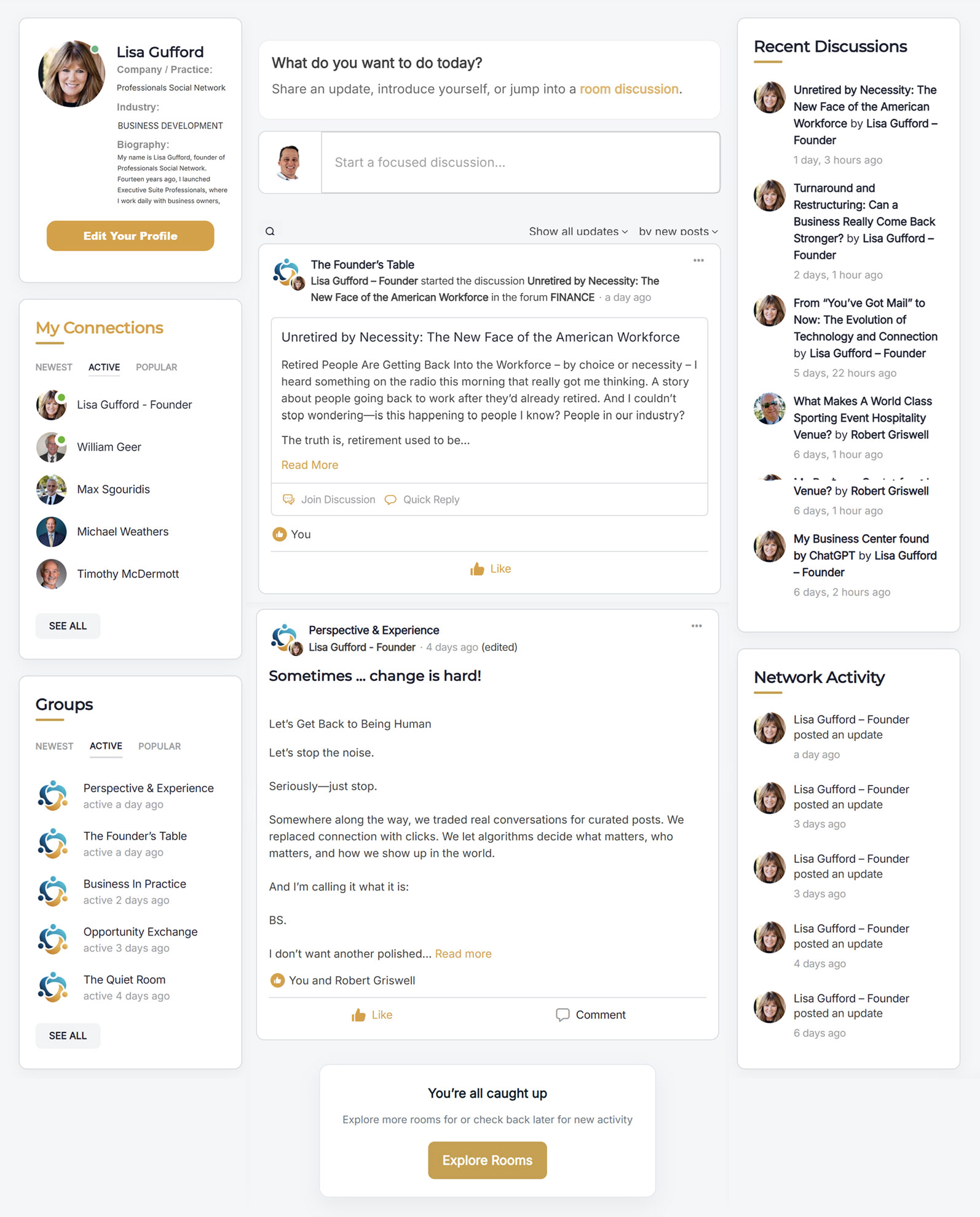 A real look at the platform — the feed, the rooms, the industry discussions,